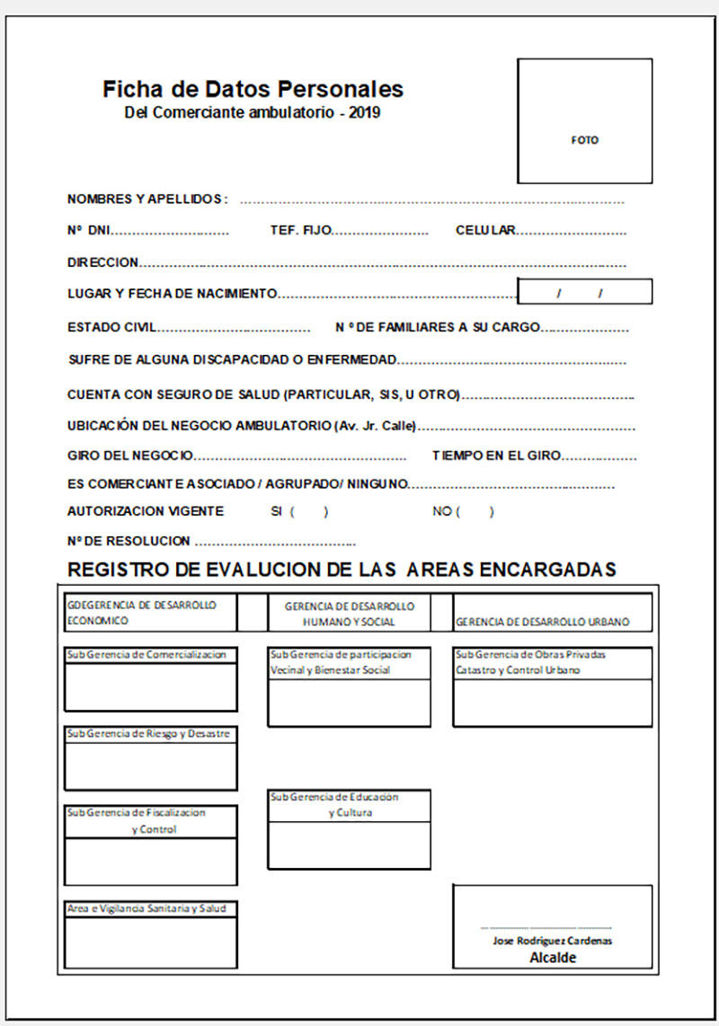 - Elaboración de ficha de datos socioeconómico del comerciante ambulante 2019.